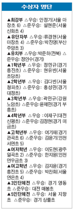 ▲ 대회 최강부, 유단자부 및 3~6학년부 입상자들이 수상 후 기념촬영하고 있다./한준호 기자 gokorea21@chosun.com