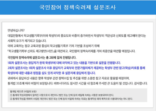 ‘학교생활기록부 신뢰도 제고방안’을 마련하기 위한 국민참여 정책숙려제 관련 교육정책 모니터링단 1차 설문조사가 구체적인 안내 없이 다짜고짜 진행돼 학부모들 사이에서 논란이 일고 있다.