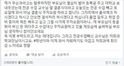 "수업 대신 딸 결혼식에 와 주차요원하라" 대학교수의 갑(甲)질 논란