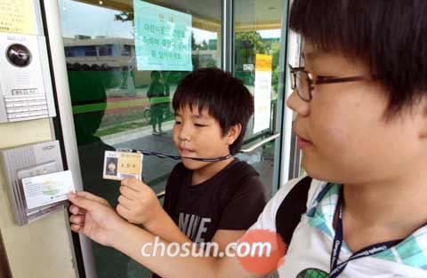 학생증은 본관에 드나드는 전자키 역할도 한다. 창도초등학교는 오전 8시 30분~오후 3시 30분 사이에만 건물 문을 활짝 열어놓는다. 그 외의 시간에는 본관 출입문이 자동으로 잠긴다. 학생증을 센서에 찍어야 열린다. 외부인이 분실된 학생증으로 '침입'을 시도해봤자 열리지 않는다.