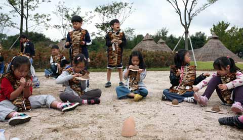 ◆체험하며 선사시대 생활 이해지하철 8호선 암사역 4번 출구로 나와 15분 정도 걸으면 움집이 있는 암사동선사주거지에 도착한다. 입구에서 우측에 있는 유물전시관 쪽으로 200m 정도 가면 '선사체험마을'이 보인다. 아이들은 선사인들이 입었을 것 같은 호랑이 무늬 원시복을 무료로 빌려 입고 체험마을에 들어갈 수 있다.