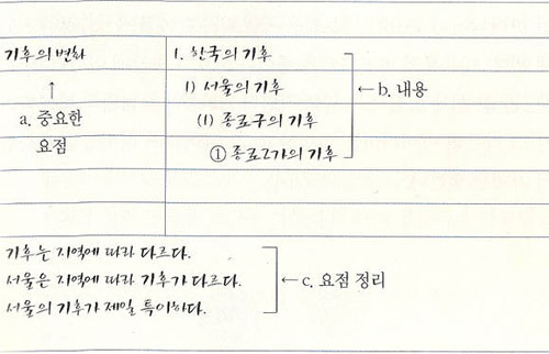 아래 그림의 b는 수업에서 적어야 할 내용으로 통상적으로 교사의 설명 중에 적는 방법과 설명이 끝난 후 적는 방법이 있다. a는 b를 적은 후 수업 내용을 대표할 수 있는 핵심적인 단어, 개념, 용어를 찾아서 적는다. 수업 내용을 필기할 때는 중요도와 범위에 따라 번호를 붙여서 쓰는 조직화가 쉽고 나중에 복습할 때도 도움이 된다.