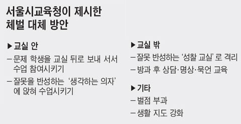 하지만 전면적 체벌금지 발표 이후 학생 생활지도가 힘들어졌다는 현장 교사들 목소리도 적지 않다. 교육당국이 마련한 체벌 대체방안이 현장에서 효력을 발휘하지 못하고 있다는 것이다.
