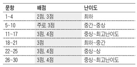 수리영역의 출제문항의 배열에는 다음과 같은 대략적인 규칙이 있다. 규칙을 잘 활용하면 수리영역 시험 100분에 대한 전략을 세우는데 도움이 될 것이다.