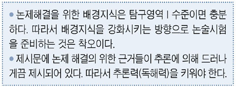 ―인문: 논제의 요구사항이 까다롭고 제시문의 수가 많으므로 속도가 중요하다. 제시문과 논제를 오가는 독해요령이 중요하다. 중요한 것은 논제의 요구사항을 명확히 이해하고 빠짐없이 서술해야 한다는 것이다.
