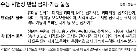 수험표를 분실했을 때는 응시원서 사진과 같은 원판으로 인화한 사진 1장과 신분증을 가지고 각 시험장의 시험관리본부에 신고해 오전 8시까지 재발급을 받아야 한다. 휴대전화, 디지털 카메라, MP3, 전자사전, 카메라펜, 전자계산기, 라디오, 휴대용 오디오 플레이어, 시각 표시와 교시별 잔여시간 표시 이외의 기능이 부착된 시계 등은 시험장 반입이 금지된다.