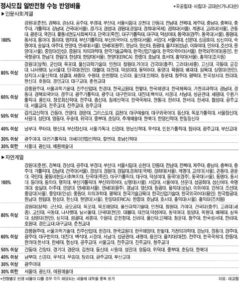 정시모집 정원 비중은 2006학년도 52%에서 2007학년도 48.5%, 2008학년도 46.9%로 계속 줄어들고 있다. 대학들이 우수 학생을 미리 뽑으려 수시모집 인원을 확대하고 있으며, 교육대학이 정원을 축소하고 약대가 체제 전환을 하고 있기 때문이라고 대교협은 분석했다.