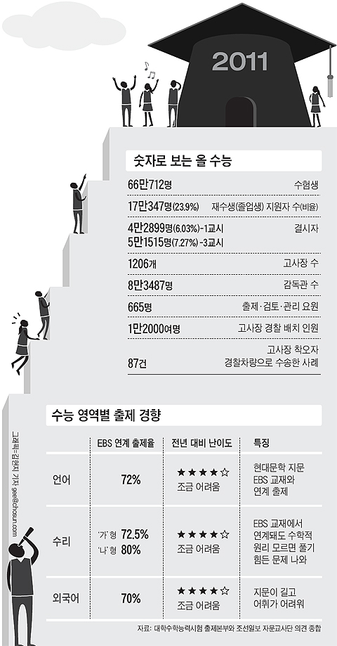 인천 연수고 김성길 교사는 "비문학 분야 지문이 어려웠지만 EBS 교재를 가지고 공부한 아이들은 크게 당황하지 않았을 것"이라고 말했다. 하지만 조효완 전국진학지도협의회 공동대표(은광여고 교사)는 "문학분야는 작년과 비슷했지만 비문학 분야는 지문도 어려웠고 예년보다 문제풀기가 어려웠을 것"이라고 분석했다. 전체적인 난이도는 지난해보다 약간 어려운 것으로 본지 수능자문교사단은 평가했다.