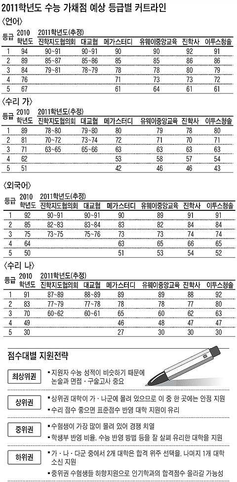 최상위권: 논술과 면접·구술이 당락 좌우수능이 어려워서 변별력이 높아졌기 때문에 최상위권 학생들은 오히려 더 유리해졌고, 하향 지원은 줄어들 것으로 예상된다. 이영덕 대성학력개발연구소장은 "최상위권은 지원자들 수능 성적이 비슷하기 때문에 앞으로 치를 논술고사와 면접·구술고사가 당락을 좌우할 것"이라고 말했다.
