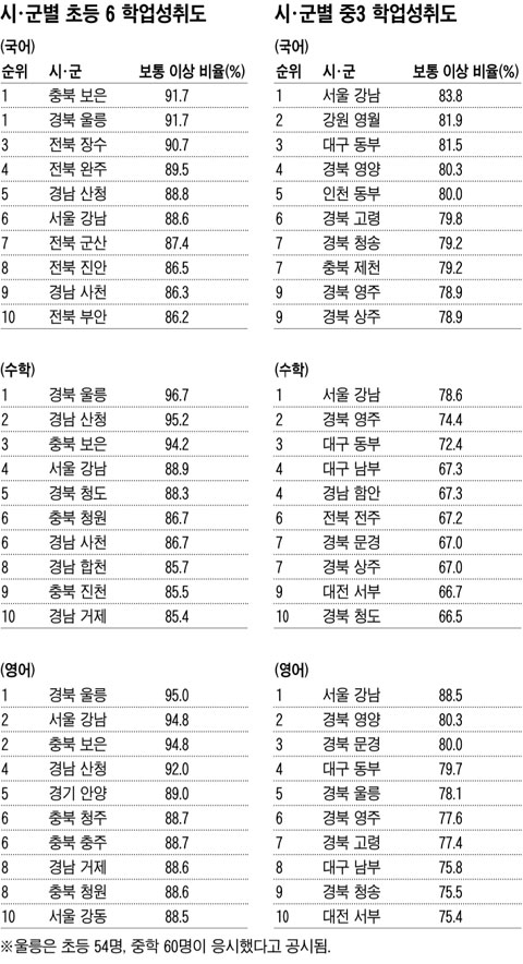 보은에서 가장 많은 학생이 다니는 동광초등학교(보통 학력 이상 평균 98%)의 홍기성 교장은 "무조건 공부만 시킨 게 아니라 인성교육을 강조하고 체육과 음악·미술도 고르게 가르쳐서 아이들의 정서를 안정시켰다"고 말했다. 이어 학력이 뒤처지는 아이들을 따로 꼼꼼히 지도하도록 배려했다는 것이다. 여기에는 담임이 아닌 교사가 학생과 1대1 멘토링 결연을 하도록 도와준 보은교육지원청의 역할이 컸다. 최태호 교육장은 "교사들이 부모 역할을 대신하면서 가정적인 분위기 속에서 공부할 수 있도록 했다"고 말했다. 충북에서는 청원·진천·충주·음성 등도 전국 수위에 들었다.