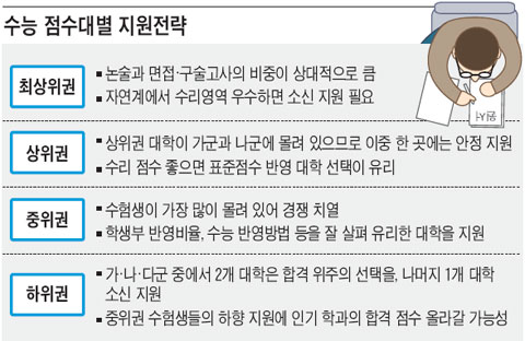 이영덕 대성학력개발연구소장은 "상위권부터 하향지원을 하게 되면 같은 대학 내에서도 상위권·하위권 모집 단위의 역전이 이뤄질 수도 있다"며 "복수 지원 기회를 잘 활용해 '가'군과 '나'군 중 하나는 합격 위주의 하향지원을 할 필요가 있다"고 말했다. 김희동 진학사 입시분석실장은 "입시는 심리 싸움이기 때문에 하향지원이 대세라면 자신의 점수에 맞춰 소신지원을 하는 것이 더 좋은 결과를 얻을 수 있다"고 말했다.