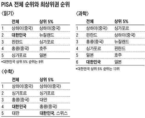 전체 학생 성적으로는 평가에 참여한 OECD 회원 34개국 가운데 읽기 1위, 수학 1위, 과학 3위(전체 65개 참여국 중 읽기 2위, 수학 4위, 과학 6위)로 뛰어난 성적을 보인 것에 비해, 최상위권 학생들의 경쟁력은 뒤처지는 것이다. 한국은 3년 전 PISA에서도 최상위권의 과학 성적이 세계 17위였지만 이번에도 크게 개선되지 않았다.
