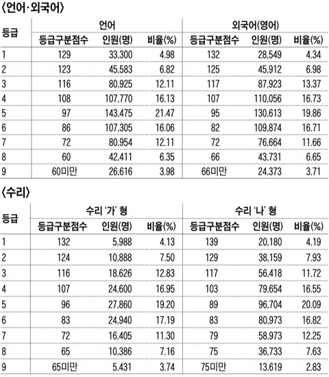 전국진학지도협의회 조효완 공동대표(은광여고 교사)는 "올해 수리 가형이 상당히 어렵게 출제돼 자연계 학생들의 당락을 가를 것"이라며 "인문계는 지난해와 비슷한 수준으로 출제된 외국어 영역보다는 표준점수가 더 올라간 언어 영역이 승패를 결정지을 것으로 본다"고 말했다.