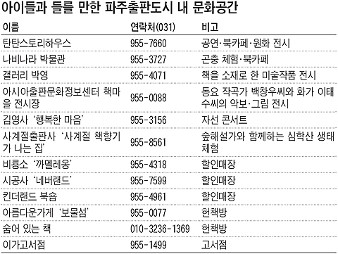 책을 소재로 한 전시회·콘서트주말 출판도시에는 책을 소재로 한 전시와 자선 콘서트도 열린다. 박영사가 운영하고 있는 '갤러리 박영'에서는 개관 2주년 기념 'Book to Book'전(展)이 열리고 있다. 김영미, 김중식 등 국내외 유명 작가 14명이 책을 소재로 한 작품 24점을 전시한다.