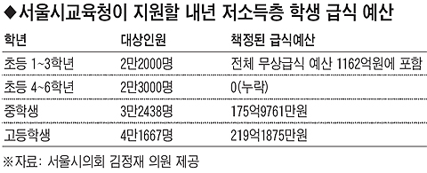 서울시 협조를 얻기 어렵다고 판단한 교육청이 내년에는 1~3학년만 무상 급식을 실시하겠다고 하면서 4~6학년 저소득층 아동들에게 돌아갈 무상 급식예산이 공중에 붕 떠 버린 것이다. 학교급식법에 따르면 교육청은 국민기초생활수급자 자녀나 한 부모 가정 자녀, 특수교육 대상자 등 저소득층 자녀를 위한 급식 지원을 의무적으로 해야 한다. 현재 서울시 4~6학년 저소득층 아동은 약 2만3000여명, 이들을 위한 급식비 편성에 필요한 예산은 약 110억원이다(시교육청 추산).