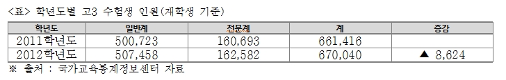 2011학년도에 이어 2012학년도에도 고등학교 3학년 수험생 수가 증가하여 입시 경쟁은 더욱 치열해질 전망이다.
