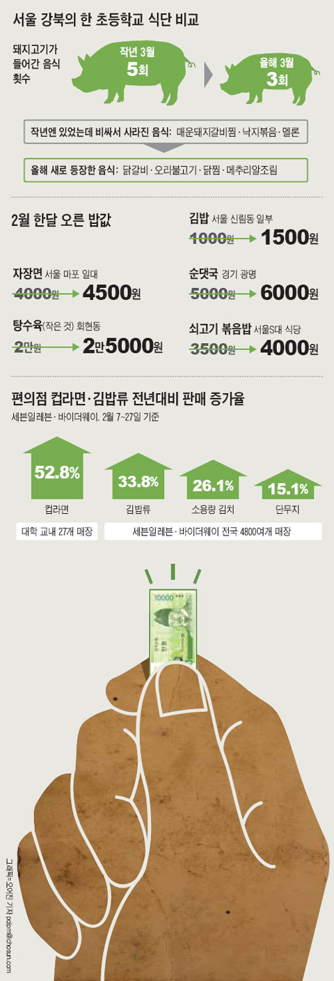 구제역·AI(조류 인플루엔자) 여파로 육류는 말할 것도 없고 채소와 생선 등 밥상에 오를 먹을거리 가격이 하루가 다르게 뛰고 있다. 주부들의 시름은 깊어만 간다. 식당들도 줄줄이 음식값을 올리고 있다. 아예 도시락을 싸거나 편의점 간편식으로 점심을 때우는 직장인도 늘었다. 식재료 값은 폭등하는데 한정된 예산으로 운영해야 하는 학교 급식은 '품질 위기'에 직면해 있다.