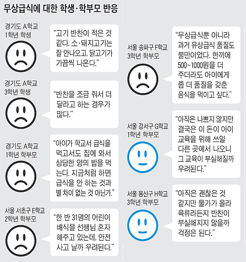 A초등학교는 고심 끝에 학생에게 주는 반찬량을 조금씩 줄이고 있다. 학교 관계자는 "지난해엔 한 사람당 한 끼에 20g 정도의 채소를 줬는데, 올해는 이를 18g으로 줄였다"고 말했다. 식단도 대체되고 있다. A학교가 지난 3~10일 사이에 제공한 메뉴 중에 소고기·돼지고기는 찾아볼 수 없었다. 육류는 '닭갈비'가 한 번 있었다. 이 학교 앞에서 만난 학부모 김모(35)씨는 "애가 학교에 다녀와선 급식에서 생선류만 나온다고 불만스러워한다"며 "집에 오면 간식을 꼭 챙겨 먹이고 있다"고 말했다.