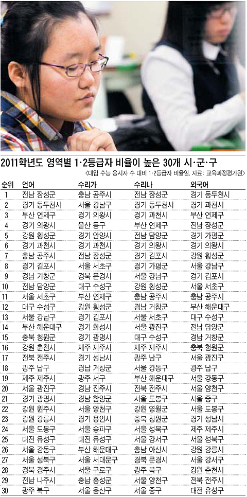 상위권 학생이 얼마나 있나를 보여주는 1·2등급(상위 11%) 비율을 보면 장성군 학생들은 '언어'와 '수리 나'영역에서 전국 1위, '외국어'에선 4위, '수리 가'에선 7위에 올랐다. 상위권 학생비율에서 서울 서초구 고교 평균보다 모든 영역에서 앞선 것이며 강남구와 비교해도 수리 가(서울 강남구 2위)만 제외하고는 모두 압도했다.