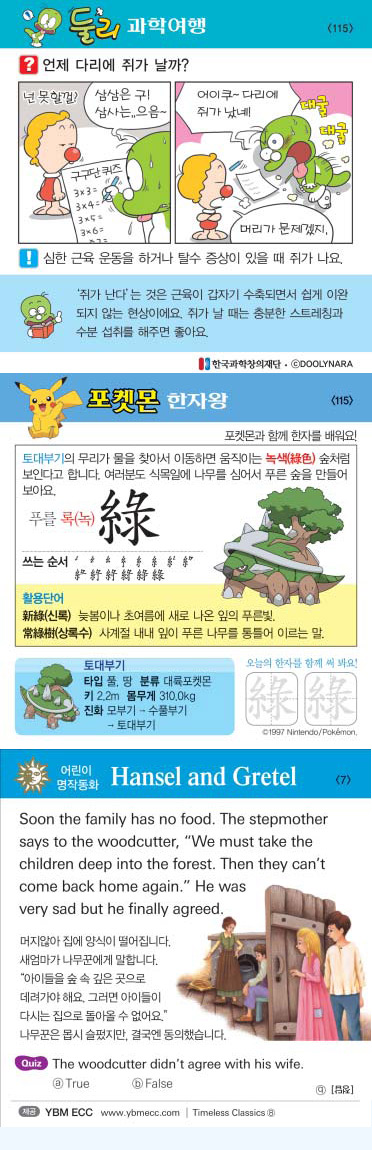이 지면은 매주 월요일부터 금요일까지 조선일보에 한 페이지씩 실리며 과학, 책 이야기, 창의력 퀴즈, 시사상식,체험학습 등 요일 별로 주제를 달리하고 있습니다. 또 어린이들이 좋아하는 캐릭터를 활용한 ‘둘리 과학여행’, ‘포켓몬 한자왕’과 영어 명작 동화는 고정 코너로 매일 인기리에 연재되고 있습니다.