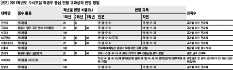 주요 대학들의 학생부 반영 방법을 살펴보면, 전형 유형마다 학생부 교과와 비교과 영역의 반영 비율이 다르다. 2011학년도 대학 입시에서 같은 학생부 100% 전형이라도 경희대 수시 2차 교과우수자 전형은 교과 성적만을 100% 반영하지만, 이화여대 학업능력우수자 전형은 교과 90% + 비교과 10%로 반영하였다. 또한 단계별 전형의 경우 단계별로 교과와 비교과 비율을 달리하여 반영하기도 한다. 지난해 한양대 학업우수자 전형은 1단계는 교과 100%, 2단계는 비교과 100%를 반영하였다. 최근 학생부 위주의 주요 전형에 입학사정관제도가 도입되면서 서류평가에 비교과 영역을 포함하여 반영하는 대학이 많아졌다. 하지만 비교과 영역의 경우 단기간에 다양한 활동을 하기가 쉽지 않기 때문에 당장 2012학년도 입시를 준비해야 하는 수험생들의 입장에서는 교과 성적 관리에 중점을 둘 수밖에 없다.