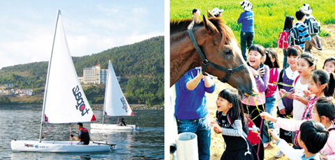 쪽빛 바다에서 짜릿한 남해_ 볼거리, 먹거리, 즐길거리가 많아 '보물섬'이라 불리는 남해(http://tour.namhae.go.kr)에서 해양레포츠를 체험해볼까? 경남 남해군 삼동면 물건항에 자리한 남해군 요트학교(http://yacht.namhae.go.kr)에서는 요트를 체계적으로 배울 수 있고 체험도 해볼 수 있다. 아이들과 함께 배우기에 요트가 어렵다면 카약에 도전해보자. 아빠와 아들이 함께 노를 저으며 부자간의 정도 두텁게 만든다는 씨카약은 상주면 양아리 두모마을(www.dumotown.com)에서 체험할 수 있다. 또한 마을 어귀에 조성되어 있는 솔숲에선 온 가족이 함께 캠핑도 즐길 수 있다.