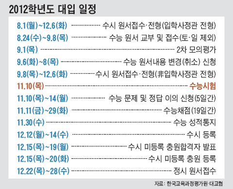 수시 원서 접수와 전형은 9월 8일부터 12월 6일까지며 합격자 발표는 12월 11일까지로 예정돼 있다. 그러나 입학사정관제 전형의 경우에는 원서 접수 시작이 8월 1일로 앞당겨졌다.