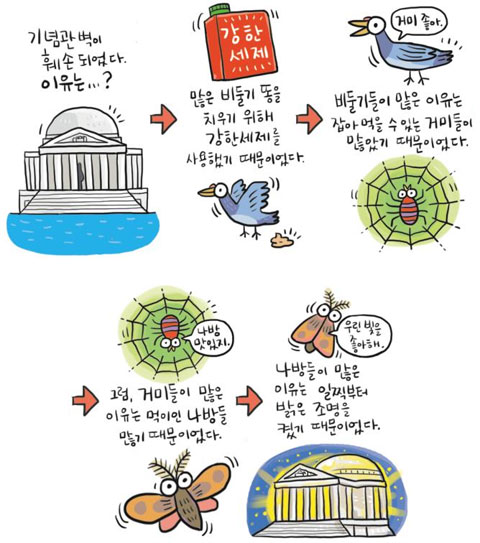 하지만 문제는 해결되지 않았어요. 문제가 해결된 것은 한참 시간이 지난 다음이었어요. 매니저는 오랜 시간 관찰하고 생각하며 기념관 천장에 거미들이 줄을 치는 이유가 무엇인지 알아내기 위해 애썼어요. 거미들이 기념관에 거미줄을 치는 것은 밤마다 수많은 나방이 떼를 지어 기념관으로 날아들기 때문이었어요. 나방들을 먹이로 삼는 거미들에게 기념관은 최고의 서식지였던 것이지요. 그러니 거미를 먹이로 삼는 비둘기 또한 줄지 않았던 거고요.