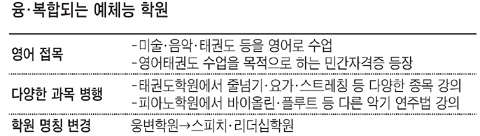 예·체능학원들이 살아남기 위해 '변신' 중이다. 입시체제가 국·영·수 중심으로 굳어지면서 예·체능학원에 대한 수요가 감소하자 2~3개 영역을 융합한 학원들이 늘어나고 있다.