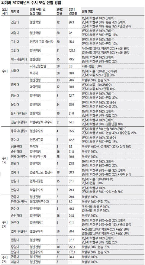 대부분 수시모집에서 선발지난해부터 수시모집에서 처음으로 신입생을 선발한 동아대, 한림대가 2012학년도 수시모집에서도 신입생을 선발하기로 함에 따라 의학계열이 설치된 대학들은 대부분 수시모집에서 신입생을 선발할 예정이다(단, 강릉 원주대 치의예과는 농·어촌 학생만 선발). 서울대는 지난해와 마찬가지로 지역균형선발 전형 20명, 특기자 전형 20명 등 총 40명을 선발하며 연세대 의예과의 경우 일반우수자, 과학인재, 진리자유, 연세한마음 전형 등으로 36명을 선발한다.