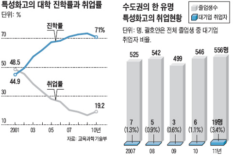 이렇다 보니 특성화고는 '실무교육과 취업에 특화한 학교'라는 이름이 무색할 정도였다. 2010년 취업률 역시 19.2%에 불과했다. 입학할 때는 실무교육과 취업을 목표로 들어온 학생들도 닫혀 있는 취업문에 절망하고는 대학 진학으로 진로를 바꾸었다. 2010년 특성화고 학생들의 '대학(전문대학 포함) 진학률 71%'가 그것을 말해준다.