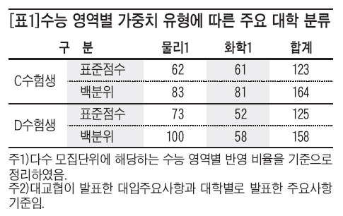 자연계열 상위권 대학들은 수리와 외국어의 반영 비율이 높거나 경희대, 성균관대, 연세대, 인하대와 같이 수리와 과학탐구에 가중치를 부여하는 경우가 대부분이다. 물론 고려대처럼 언·수·외를 동일하게 반영하거나 서울대처럼 수리에만 가중치를 부여하는 대학도 있다. 하지만 자연계열 상위권 학생들은 수리와 과탐을 중심으로 학습 전략을 짜는 것이 좋다. 그 이유는 수시모집의 자연계열 논술이 수학과 과탐을 활용한 문제가 주로 출제되기 때문이다. 따라서 수시와 정시 두 마리 토끼를 동시에 잡기 위해서는 수리와 탐구 중심으로 학습 방향을 설정하는 게 좋다.