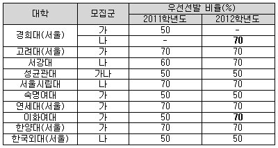 2012학년도에도 대부분의 대학들이 지난해와 비슷한 우선선발 비율(50%~70%)을 유지하는 가운데, 경희대와 이화여대는 우선선발 비율을 50% → 70%로 상향 조정했고, 성균관대(나군) 자연계열은 우선 선발 언어와 외국어 수능최저학력이 등급 합 7 이내로 우선선발 자격을 제한한다.