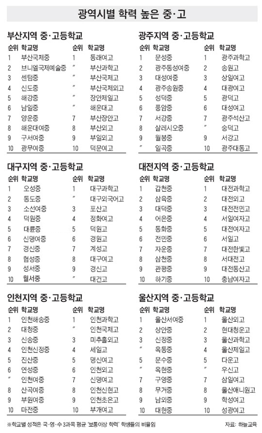 부산의 경우 2010년 자율고로 지정된 동래여고와 해운대고가 특목고인 부산과학고·부산국제고·부산국제외고와 공동 1위에 올랐다. 광주광역시에선 자율고인 송원고가 지난해 42위에서 올해 2위로 무섭게 치고 올라왔다. 대구에서도 자율고 3곳이 10위 안에 들었다.