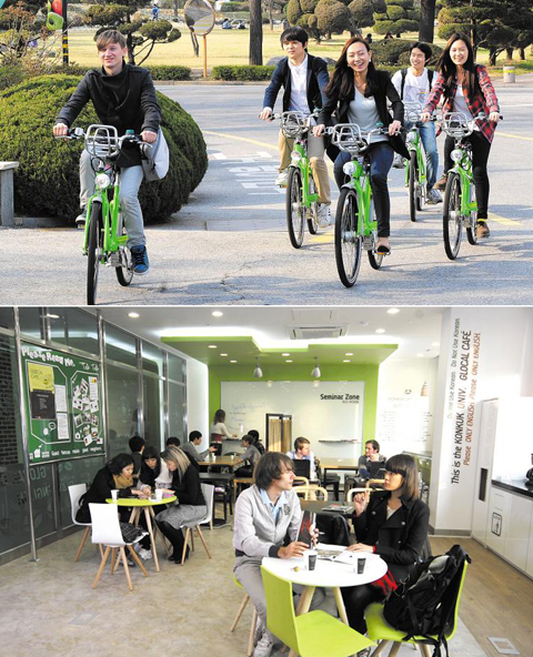 영어와 취업. 건국대 캠퍼스에서는 대학생들이 절실히 바라는 이 두 가지를 모두 찾을 수 있다. 이름만 거창한 프로그램들이 아니다. 성공한 선배들을 보고 후배들이 또 찾게 되는 지원프로그램들이 빼곡하다. 건대 캠퍼스를 거닐면, 국제화와 친환경도 직접 느낄 수 있다.