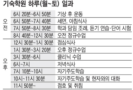 ◇일주일 내내 과외받는 효과오전 6시 20분, 기상 음악이 흘러나오자 학생들이 삼삼오오 기숙사를 빠져나와 강의동 앞에 섰다. 건강상태 등 생활지도교사의 조례를 받고 간단한 체조로 하루를 연다. 아침 식사는 1시간가량, 양치질을 마치고 강의실로 향한다.
