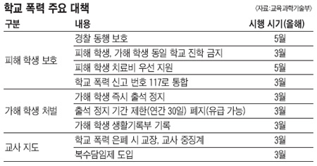 학교 폭력 가해 학생 처벌 수위는 한층 강화된다. 가해 학생은 학교 폭력을 일으키는 즉시 학교장 판단에 따라 출석 정지될 수 있다. '학교 폭력을 신고했다'고 피해 학생을 보복 폭행할 경우 가중처벌을 받는다. 학교 폭력 내용은 가해 학생 생활기록부에 기재된다.
