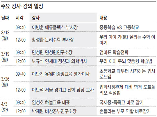 수원 브런치에듀에선 학부모의 강력한 요청에 따라 강연 시간이 100분으로 확대되며 현직 교사 등 신규 강사진이 합류합니다. 입학사정관제 대비 포트폴리오 전략, 흔들리는 부모 역할 바로잡기 등 기존 인기 강사들도 새로운 주제로 강연을 꾸밀 예정입니다.