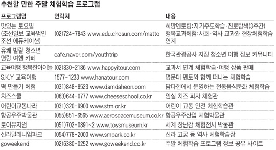 초등생용 교육여행 프로그램도 인기다. 교육여행 행복한아이들(이하 ‘행복한아이들’)은 △반나절 체험학습 △종일 체험학습 △1일 현장학습 △학부모와 함께 떠나는 가족여행 등 다양한 여행 상품을 판매하고 있다. 특히 눈길을 끄는 건 ‘학년별 교과 체험’. 초등 고학년(3~6년)생을 대상으로 사회·과학 교과서 속 역사·환경·인물 등을 체험할 수 있도록 구성된 프로그램이다. 참가자는 ‘지도 들고 화성 돌기’ ‘세계인이 사랑하는 우리 문화’ ‘왕과 왕비를 만나다’ 등 서로 다른 주제에 따라 박물관·습지·궁궐 등을 방문해 다양한 체험에 참여할 수 있다. 권오현 행복한아이들 대표는 “체험학습은 교과서 내용 학습만으로 부족한 부분을 현장에서 보충할 기회”라며“특히 온 가족이 함께 떠나는 여행은 가족의 소중함을 일깨우고 가족 간 의사소통 부재를 해결할 수 있다는 점에서 더욱 뜻깊다”고 설명했다.