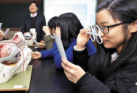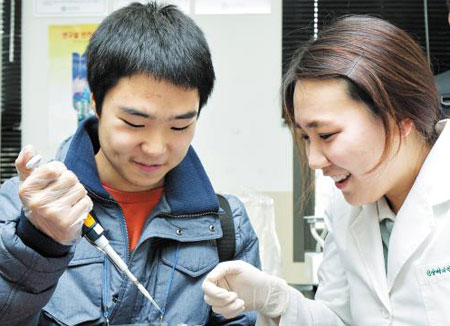 이날 행사는 오전 9시 30분부터 오후 5시까지 계속됐다. 참가 학생들은 8개 조로 나뉘어 △인체 뼈 구조 관찰 △치아 모형 만들기 △내 혈액 성분 관찰 등 다양한 체험 프로그램에 참여했다. 특히 인기가 높았던 프로그램은 '뇌파를 이용한 나의 인지기능 변화관찰 체험'과 '나의 척추 상태 평가와 교정 체험'이었다. '뇌파를 이용한…'은 뇌파를 활용한 인지 기능을 측정하고 일명 '뉴로피드백'으로 불리는 집중력 훈련법을 체험하는 프로그램. 주최 측은 희망자를 선발, 몸에 전극을 부착한 채 게임 형태로 뇌파 변화 과정을 관찰했다. 유예나(동대전고2)양은 "진로나 적성에 맞는 전공을 선택할 기회나 정보가 부족했는데 이번 행사를 통해 선택의 폭을 넓힐 수 있어 좋았다"며 "특히 관심 있는 학과 교수들의 연락처를 입수해 추후 진로 선택에 상당한 도움을 받을 수 있게 됐다"고 말했다.
