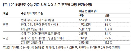 하지만 실제 수능에서 본인이 원하는 성적을 받기란 여간 어렵지 않다. 실제로 2011학년도 수능 응시생 66만8991명 가운데 언어·수리·외국어·탐구(이하 '언·수·외·탐') 영역 중 2개 영역 2등급을 충족한 비율은 인문계열 수험생의 13.9%(5만8170명), 자연계열 수험생의 12.6%(3만349명)에 불과했다