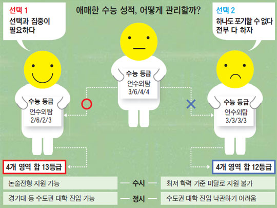 본인의 능력을 지나치게 과소평가하는 것도 문제지만 성적 향상 가능성을 과대평가해서도 안 된다. 특히 서울 소재 주요 상위권 대학 진입이 어려운 중·하위권 학생이라면 현실적 목표에 맞춰 '선택'과 '집중'을 병행하는 게 최선이다. 오른쪽 그래픽은 언·수·외·탐 성적 등급이 각각 3·6·4·4인 수험생이 2개 영역을 전략적으로 선택해 집중적으로 대비한 경우, 그리고 정시모집에 무게중심을 두고 전략 없이 전체 영역을 무조건 학습한 경우의 결과를 각각 비교한 것이다.