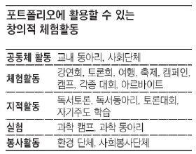 A. 적지않은 사교육 업체가 "입학사정관 전형 대비용 포트폴리오엔 화려한 스펙이 필수"라고 주장한다. 또한 많은 학생이 그 말을 곧이곧대로 믿고 이들 업체가 주도하는 체험활동 프로그램에 참가한다. 하지만 이는 틀린 주장이다. 입학사정관 전형에서 가장 중요한 건 '학교 교육과정 범위 내에서의 활동'이다. 실제로 지난해 4월 교육과학기술부와 한국대학교육협의회가 발표한 '입학사정관제 운영 공통 기준'에도 "입학사정관 전형은 학교 교육과정을 충실히 이수하는 과정에서 학습, 체험할 수 있는 내용을 중심으로 진행된다"는 내용이 명시돼 있다.