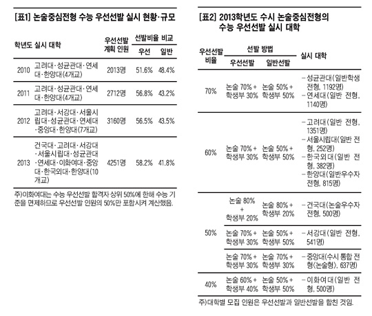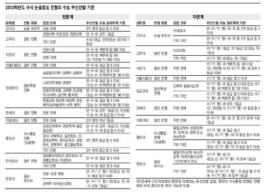 올해 수시모집에선 건국대·이화여대·한국외대가 논술 전형에 수능 우선선발 유형을 도입했다. 건국대는 '논술우수자 전형'의 모집 인원을 지난해 381명에서 500명으로 늘리고 이 중 절반을 수능 우선선발 유형에 배정했다. 한국외대 일반 전형은 지난해까지 우선선발 유형과 일반선발 유형의 수능 최저 기준이 같았다. 하지만 올해부턴 우선선발 유형의 수능 최저 등급이 높아지며 상대적으로 수능 성적의 비중이 커졌다. 이화여대는 지난해까지 우선선발 유형에서 수능 최저 학력기준을 적용하지 않았다. 하지만 올해부턴 우선선발 합격자의 상위 50%만 수능 기준이 면제된다. 나머지는 수능에서 높은 등급을 받아야 한다.