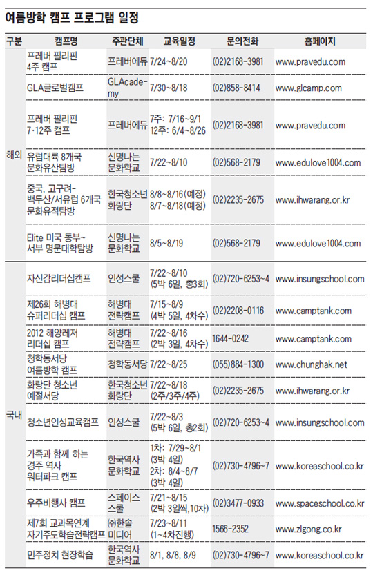 교과서를 이용하는 구체적인 학습법과 예ㆍ복습 방법을 익히는 학습전략 캠프다. 학습습관의 기틀을 잡아주는 '4 DAY PROJECT'를 진행한다. 학습조절 능력검사, 동기부여, 교과서 기억법, 시간 관리법 등의 강의가 포함돼 있다. ●한솔미디어: (02)1566-2352 zlgong.co.kr