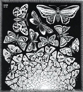 에셔는 위 그림 속 나비에서 보듯 평면에 동물이나 새, 물고기를 반복적으로 대칭 배열한 후 일정 단위로 반복되는 구도를 사용했다.