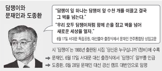 논란의 핵심, '담쟁이'이번 논란의 핵심은 '정치적·파당적 편견을 전파하는 내용'을 어떻게 해석하느냐는 점이다. 도 의원의 '담쟁이'(1993년 발표 시집 '당신은 누구십니까'에 수록)가 특히 논란이 되는 것도 이 때문이다. 문 고문은 지난달 17일 대선 출마를 선언하며 "담쟁이 잎 하나는 담쟁이 잎 수천개를 이끌고 결국 그 벽을 넘는다"는 시구를 언급했다. 문 고문의 대선 출마를 외곽에서 지지하는 싱크탱크 모임 이름도 '담쟁이 포럼'이다. 시인이 작품을 썼을 때의 '담쟁이'와 현 정치 상황에서의 '담쟁이' 의미가 크게 다른 것이다.