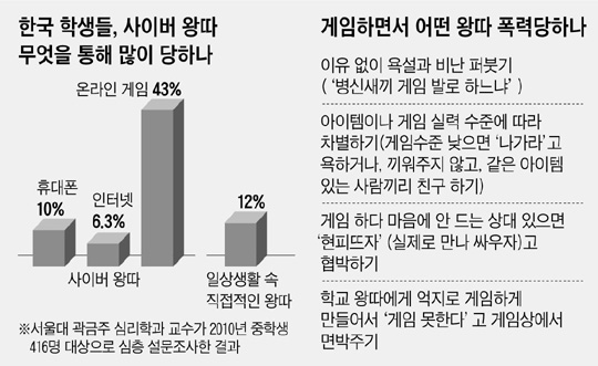 학생 43%, "게임하다 왕따 폭력 당했다"일주일에 하루도 빼지 않고 매일 게임을 하는 학생이 11.4%(게임물등급위원회 통계)에 달할 정도로 우리나라 학생들 사이에 게임이 유행이다. 상당수 학생이 현실 세계와 온라인 세계에서 동시에 살고 있는 것이다. 그만큼 현실 세계 못지않게 게임세계에서 벌어지는 왕따 폭력 피해 역시 심각해지고 있다.