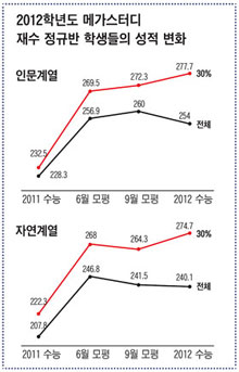 실제로 2012학년도 메가스터디학원 재수 정규반 수강생의 시기별 성적 변화를 살펴보면 재수 시작 전인 2010년 수능 시험일(2011학년도) 이후부터 이듬해 6월 모의평가 사이의 기간에 성적이 가장 많이 올랐다(인문계열 28.6점, 자연계열 39점 각각 상승). 특히 성적 향상률이 높았던 상위 30% 학생은 인문계열과 자연계열의 점수 상승 폭이 각각 37점과 45.7점이었다. 특히 이들은 6월 모의평가 이후 수능까지의 성적도 꾸준히 향상된 것으로 조사됐다(인문계열 8.2점, 자연계열 6.7점)〈이상 그래프 참조〉.