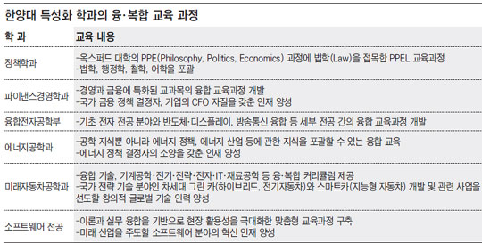 한양대는 학문 간 융합을 기본으로 하는 특성화 학과들이 다양하다. '정책학과'는 영국 옥스퍼드대학의 PPE(Philosophy, Politics, Economics) 과정에 법학(Law)을 접목시킨 PPEL 교육 과정을 운영하고 있다. 법학, 경제학, 행정학, 철학, 어학을 포괄하는 것이다. '파이낸스경영학과'는 경영과 금융이 융합된 교육을 진행해 국가 금융정책 결정자나 기업의 CFO 자질을 갖춘 인재를 키우려 한다.
